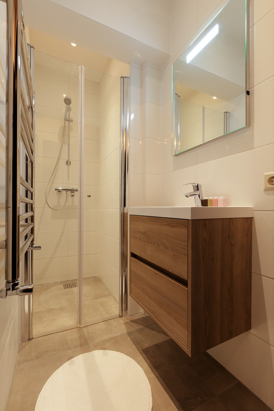 Upon entering the apartment, you step into the spacious living room, which provides access to a large balcony. Adjacent to the living room is the bedroom, which has access to a second, smaller balcony. The neat bathroom features a shower, a sink with a vanity unit, and there is a separate toilet.