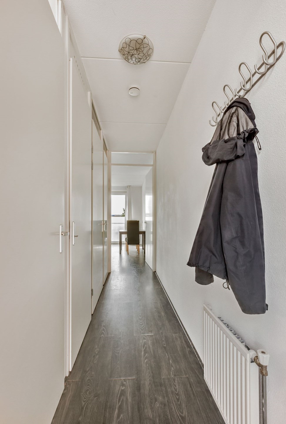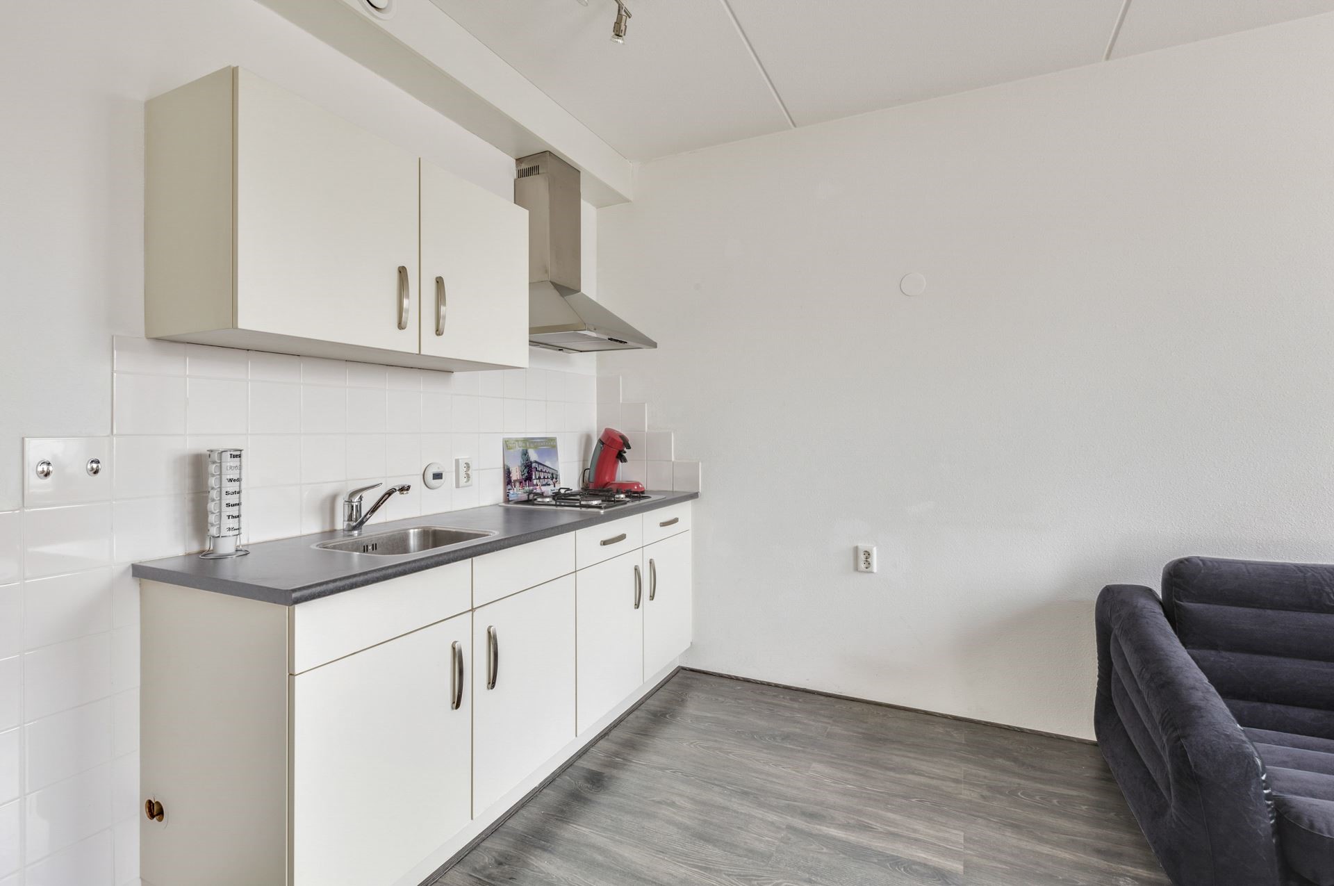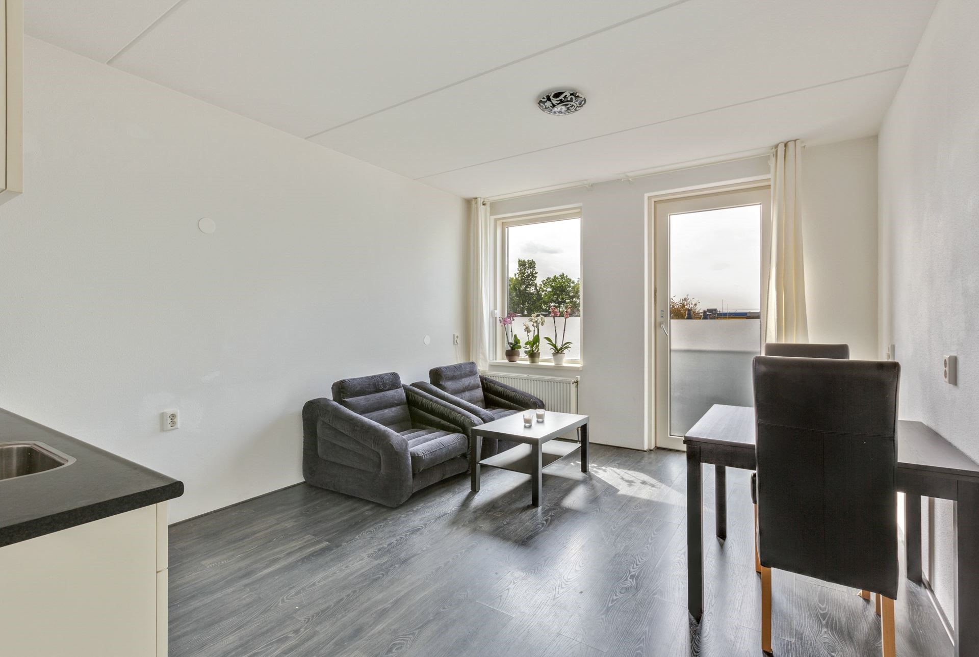 Via de galerij bereik je de entree van het appartement. Binnen kom je in de hal met toegang tot alle vertrekken. De lichte woonkamer met open keuken voelt direct ruim en gezellig aan. De keuken is praktisch ingericht en voorzien van een gaskookplaat, afzuigkap en voldoende kastruimte.
