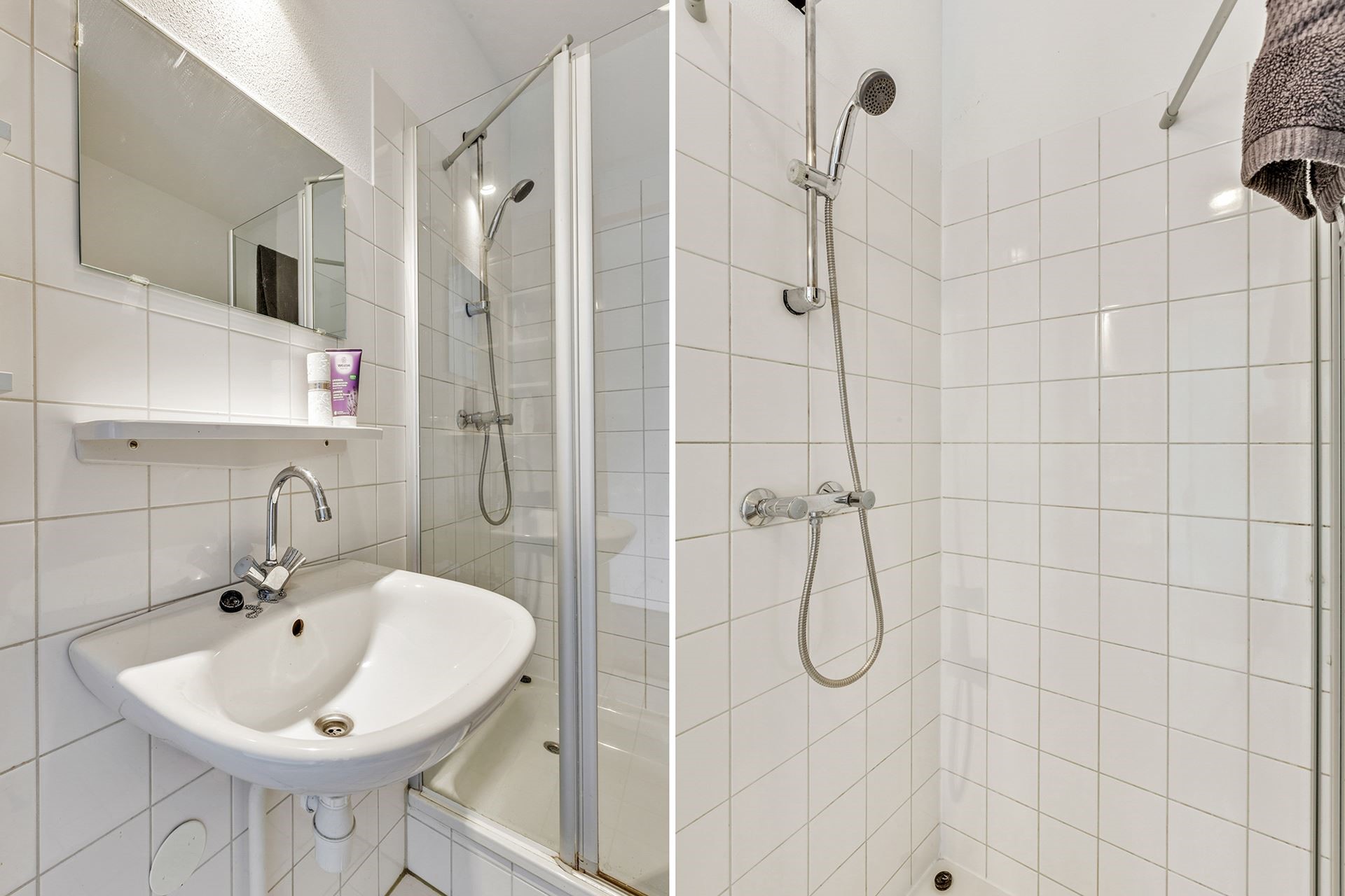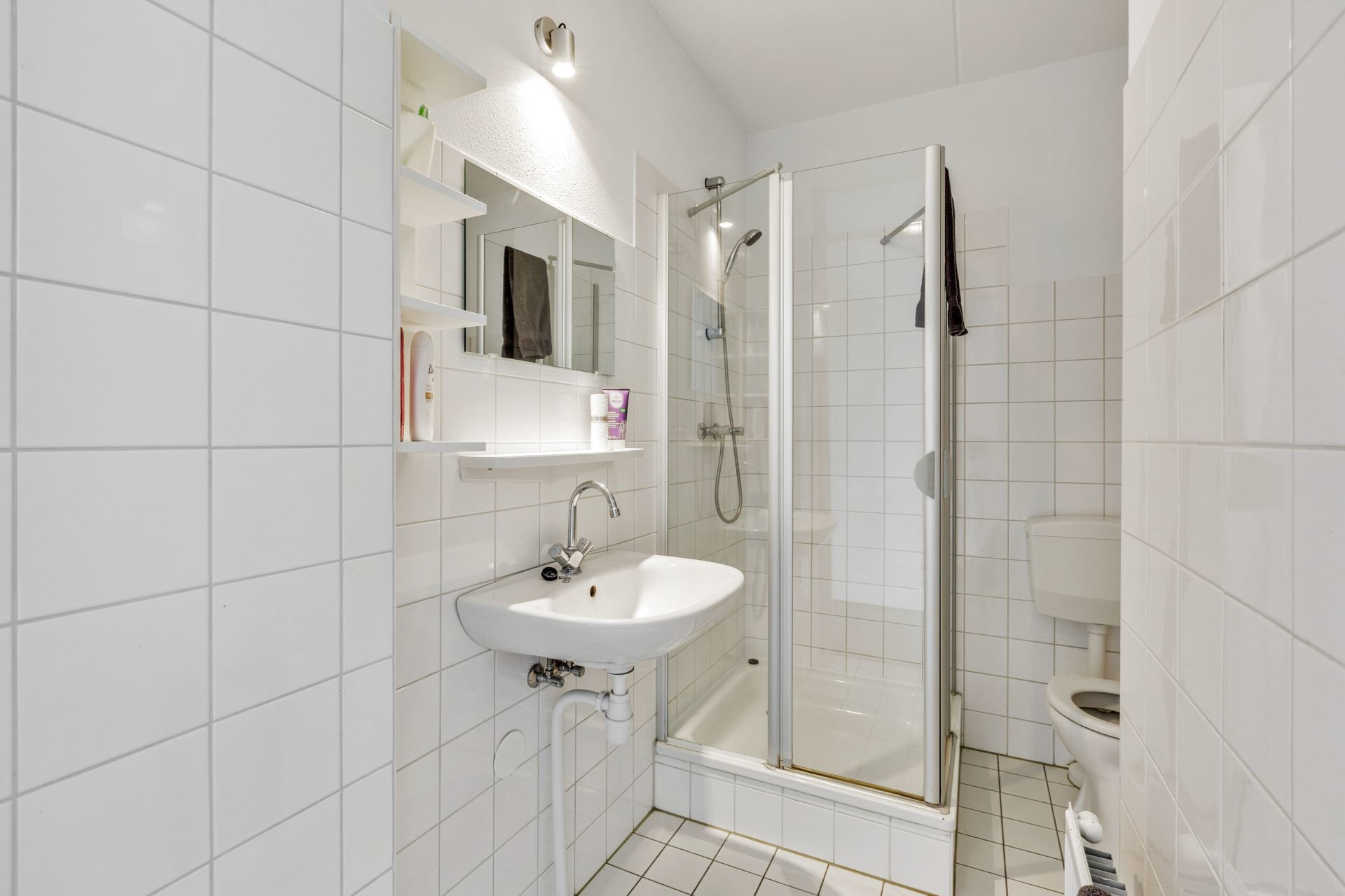 De slaapkamer ligt aan de achterzijde en heeft een groot raam dat zorgt voor veel daglicht. De badkamer is netjes betegeld en uitgerust met een douchecabine, wastafel en toilet. Daarnaast is er nog een bergkast met aansluitingen voor de wasmachine.