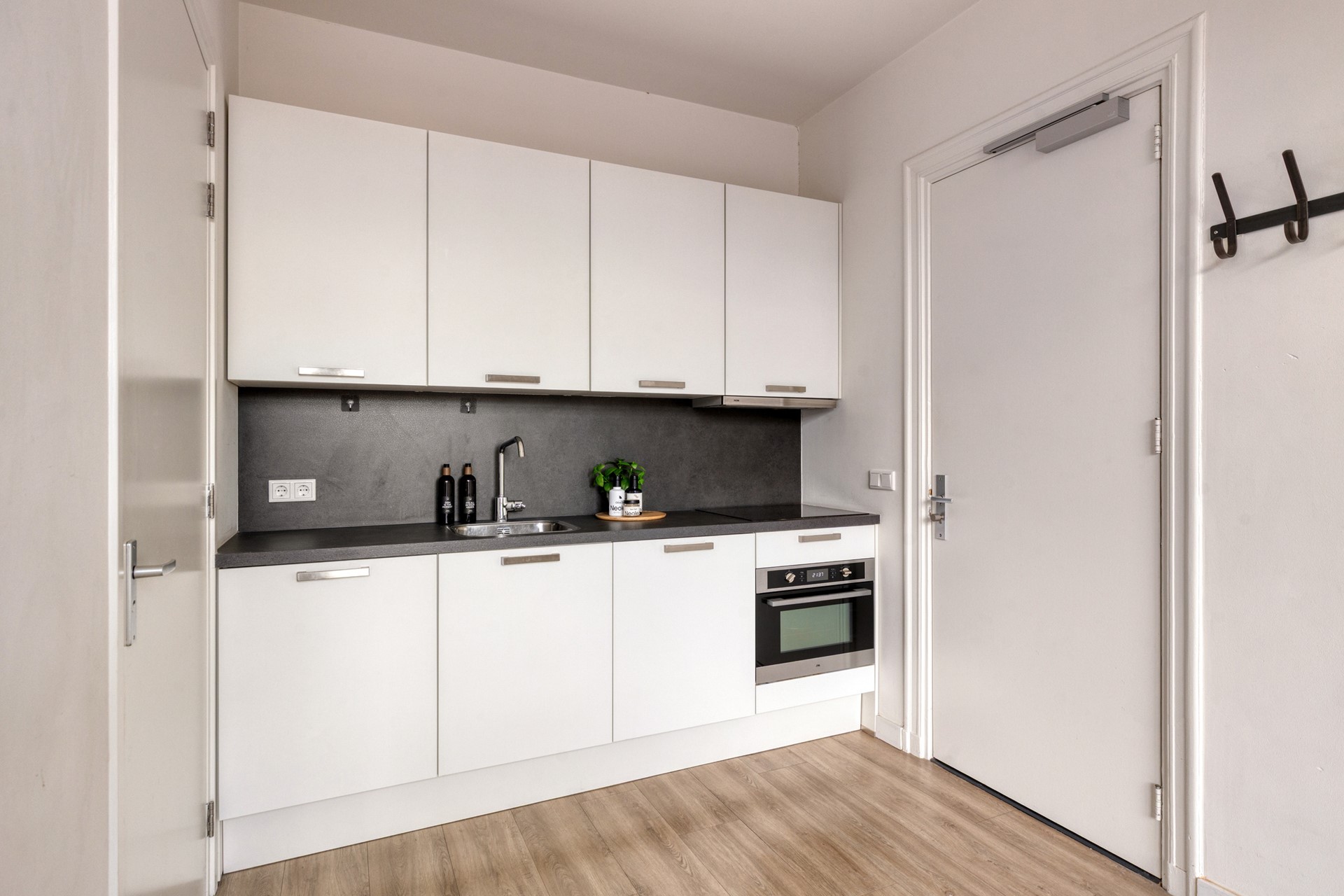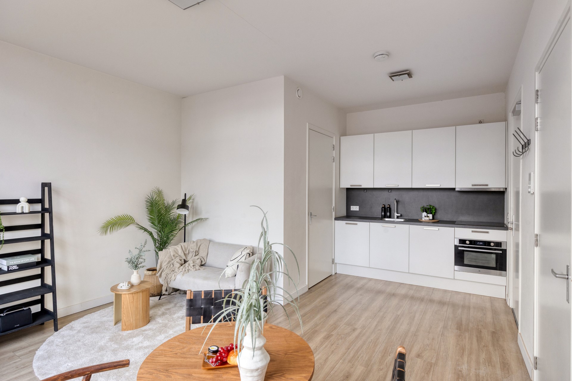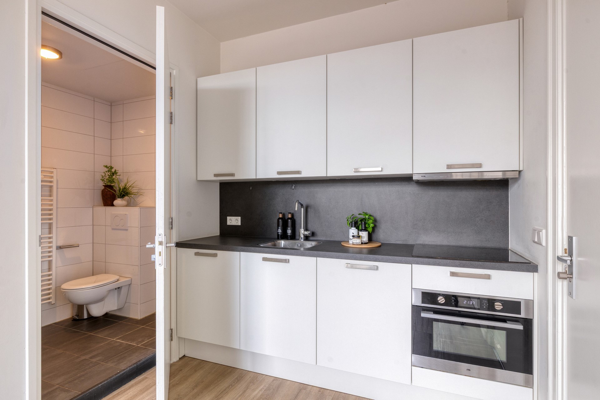 Het appartement heeft een slimme en open indeling met veel lichtinval. De woonkamer is gesitueerd aan de voorzijde en valt direct op door de hoge ramen en het prettige uitzicht op de singel. De open keuken is v.v. een vaatwasser, koelkast, combi oven/magnetron, inductie kookplaat en afzuigkap. De keuken is modern en praktisch ingericht en sluit mooi aan op de leefruimte. Aan de rustige zijde bevindt zich de slaapkamer, compact maar comfortabel. De badkamer is strak uitgevoerd en voorzien van een douche, wastafel en toilet.